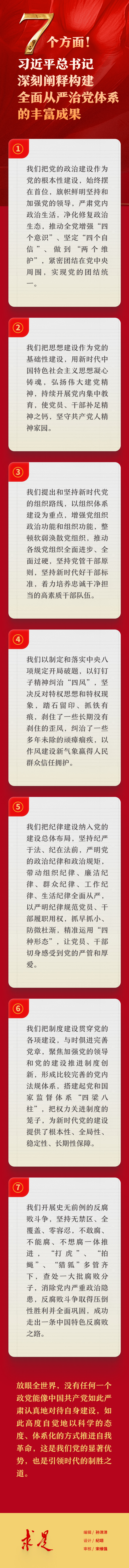 6月16日出版的第12期《求是》杂志刊发习近平总书记重要文章《健全全面从严治党体系 推动新时代党的建设新的伟大工程向纵深发展》。在这篇重要文章中,习近平总书记深刻指出:“构建全面从严治党体系是一项具有全局性、开创性的工作。新时代10年,我们党不断深化对自我革命规律的认识,不断推进党的建设理论创新、实践创新、制度创新,在构建全面从严治党体系上积累了丰富成果。”