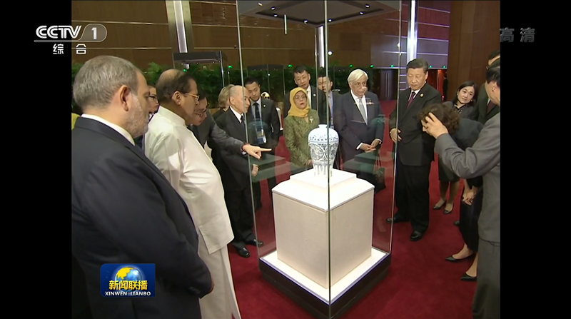 2019年5月15日,亚洲文明对话大会在北京拉开帷幕。大会开幕式前,习近平主席同出席开幕式的外方领导人一道步入展厅,共同参观文物展。一个清新淡雅的花瓶吸引了众人的目光,大家都停下了脚步,凝神观看。