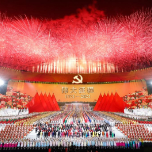 2021年6月28日晚,庆祝中国共产党成立100周年文艺演出《伟大征程》在北京国家体育场盛大举行。这是文艺演出结束,全场共同高唱《没有共产党就没有新中国》。新华社记者 黄敬文 摄