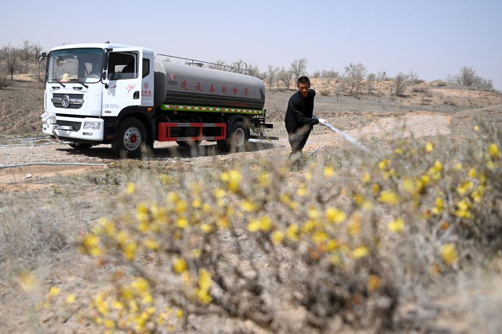 4月11日,在古浪县八步沙林场眼窝子沙治沙点,郭玺浇灌植被。新华社记者 范培珅 摄