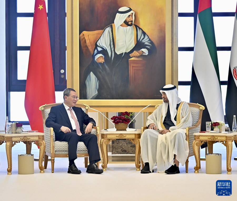 当地时间9月12日上午,国务院总理李强在阿布扎比祖国宫会见阿联酋总统穆罕默德。新华社记者 岳月伟 摄