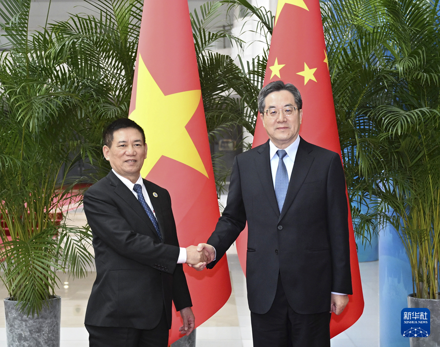 9月24日,中共中央政治局常委、国务院副总理丁薛祥在广西南宁会见来华出席第二十一届中国-东盟博览会暨中国-东盟商务与投资峰会的越南副总理兼财政部长胡德福。 新华社记者 燕雁 摄