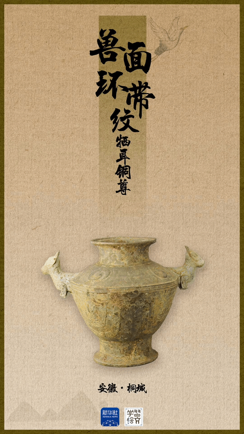 兽面环带纹牺耳铜尊1994年出土于桐城市孔城镇,属春秋时期桐国的礼器,也是盛酒器。该铜尊肩部附有两只兽形耳,形象古朴生动。这一时期,因桐国地处吴、楚两国交界地带,文物呈现出楚文化与吴越文化以及中原文化交融的多元文化过渡带特征。