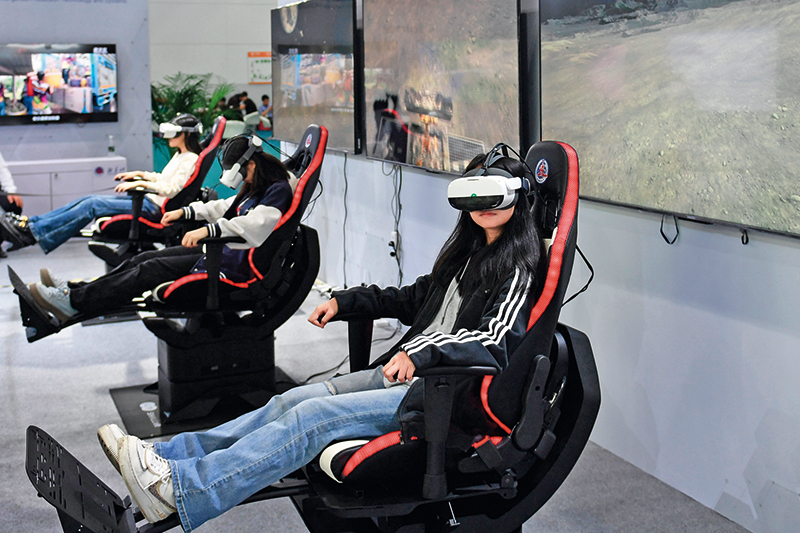 参观者在长沙举行的2024中国新媒体技术展上佩戴VR眼镜,体验“遨游月球”(2024年10月15日摄) 陈振海摄/本刊