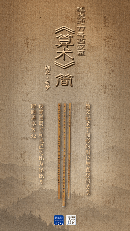 简牍里的《算术》,是古人科学智慧的精彩呈现。三枚关于计算圆形田地面积方法的西汉简牍保存完好,为首次公开展出。“有睘将来直十六与五侍之”,睡虎地汉简中列举的这道算术题显示,周长和直径之比为16:5,即圆周率为3.2,证明秦汉之际已有人认识到比3更精确的圆周率,为出土简牍所仅见,尤其珍贵。