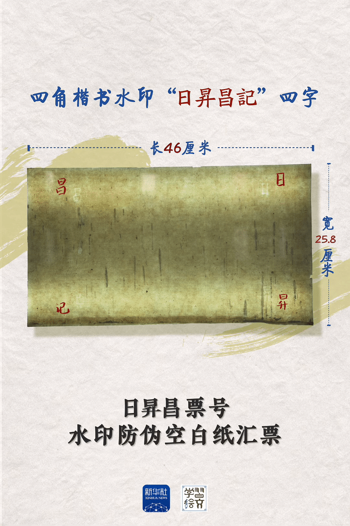 据平遥县票号博物馆讲解员李朝介绍,日昇昌汇票纸由上好的青檀皮、蚕丝等制成,并雇用能工巧匠通过纸浆的密度变化将“日昇昌記”四字暗藏于汇票纸四角,把汇票纸对着强光,可以看到楷书水印的“日昇昌記”四字。