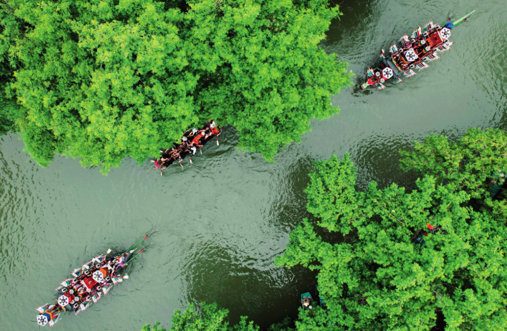 龙舟穿梭在西溪湿地的河道中(2023年6月22日摄)龙巍摄/本刊