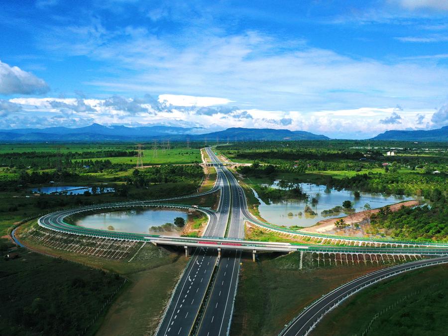 这是2023年5月8日在柬埔寨磅士卑省拍摄的金港高速公路。金港高速公路采用中国设计及质量标准,于2022年通车,成为柬埔寨第一条高速公路。新华社发(柬埔寨金港高速公路有限公司供图)