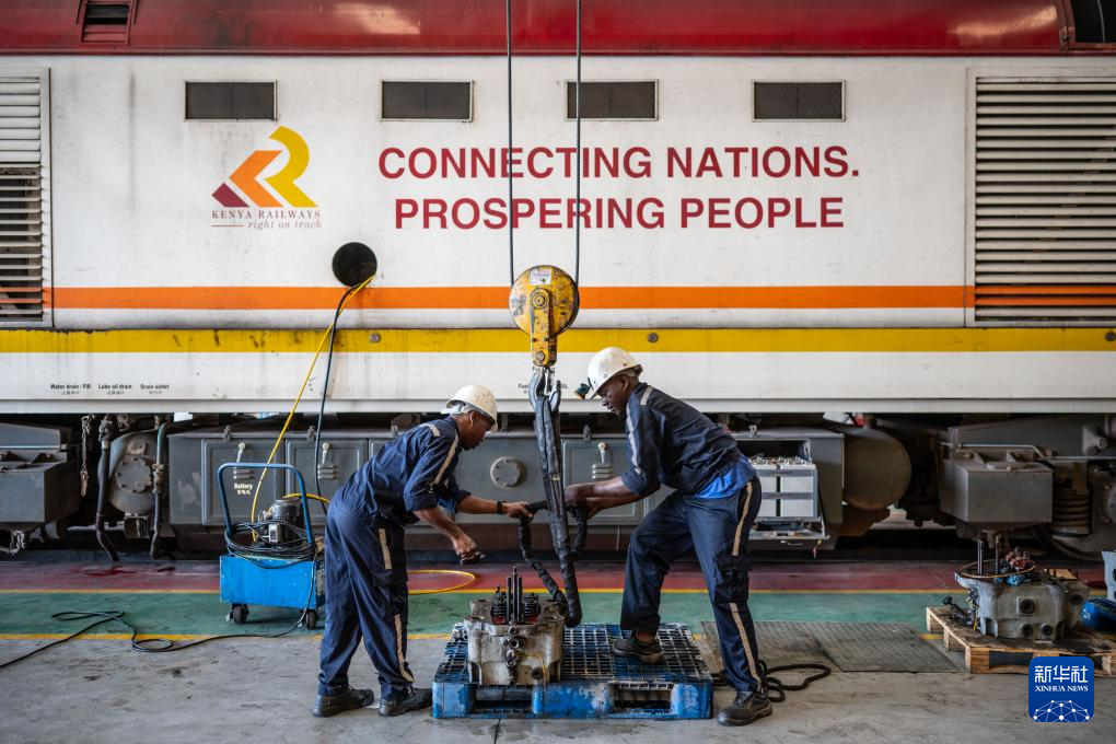 2025年1月23日,在肯尼亚内罗毕蒙内铁路车间,维保人员在一辆印有“连接国家 走向繁荣”标语的蒙内铁路机车前检修配件。 新华社记者 王冠森 摄