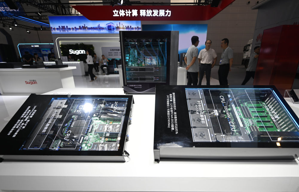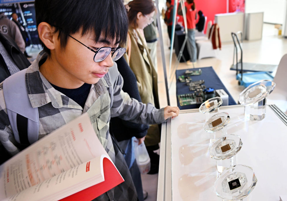 2024年11月2日,与会者在2024中国自动化大会展览区观看国产芯片。当日,2024中国自动化大会在山东省青岛市开幕。大会以“新质发展 智控未来”为主题,聚焦自动化与人工智能深度融合,探讨新产业、新技术的创新发展。