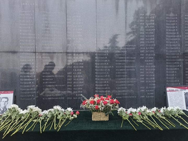 在南京抗日航空烈士纪念馆镌刻有苏联籍抗日航空英烈名录的纪念碑前,摆放着人们献上的鲜花(2024年11月22日摄)。新华社记者 邱冰清 摄
