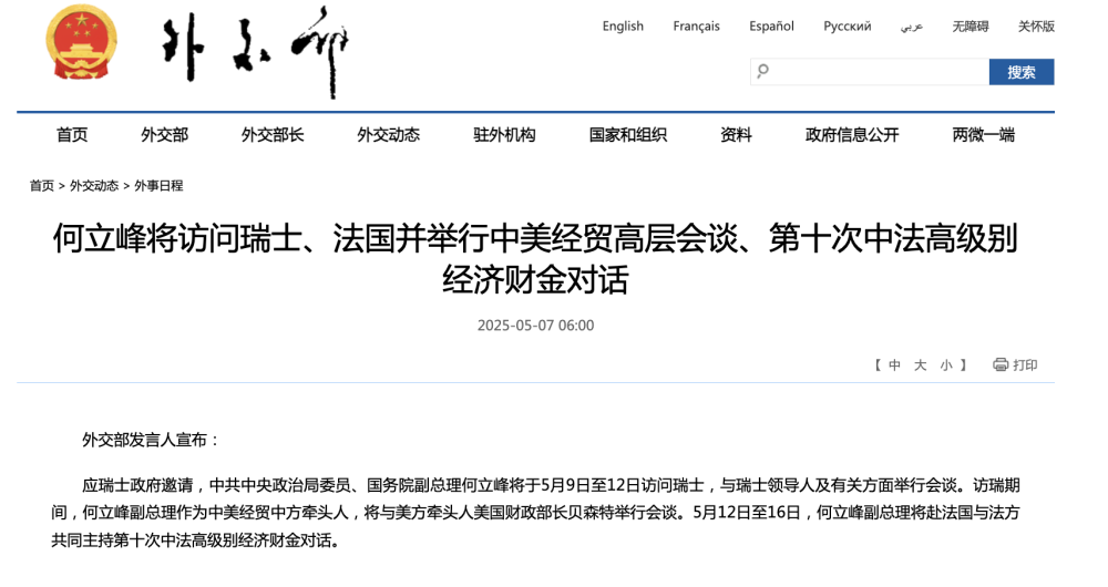 应瑞士政府邀请,中共中央政治局委员、国务院副总理何立峰将于5月9日至12日访问瑞士,与瑞士领导人及有关方面举行会谈。访瑞期间,何立峰副总理作为中美经贸中方牵头人,将与美方牵头人美国财政部长贝森特举行会谈。5月12日至16日,何立峰副总理将赴法国与法方共同主持第十次中法高级别经济财金对话。
