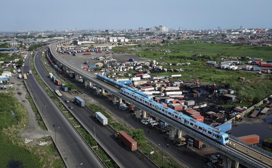 2024年3月4日,在尼日利亚拉各斯,对向行驶的两列轻轨蓝线列车会车(无人机照片)。由中国土木工程集团有限公司承建的拉各斯轻轨蓝线项目一期于2010年7月开工,2022年12月竣工,全长13公里,设有5个车站,设计时速80公里。新华社记者韩旭摄