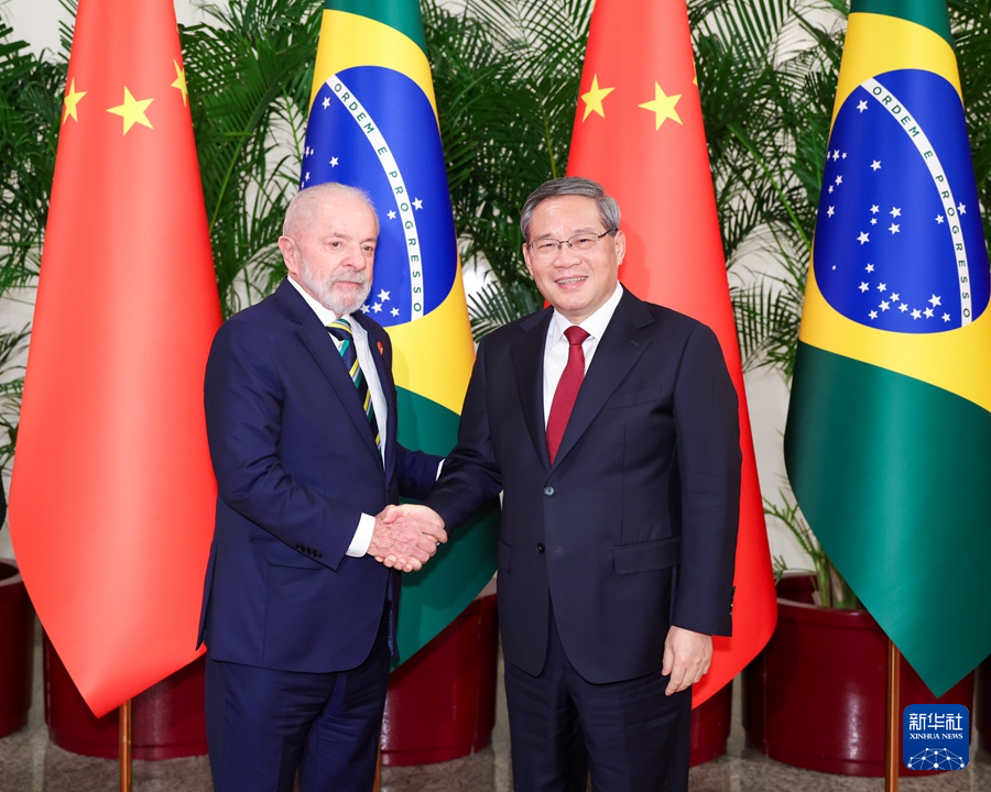 新华社北京5月13日电 5月13日下午,国务院总理李强在北京人民大会堂会见来华进行国事访问的巴西总统卢拉。
