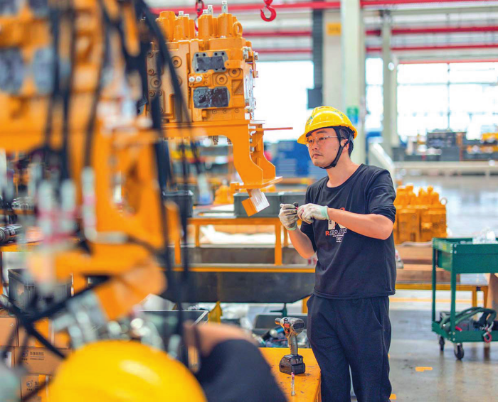 在位于重庆市两江新区的一家机械制造企业,工作人员在总装车间组装即将出口老挝、缅甸的挖掘机(2025年4月21日摄)黄伟摄/本刊