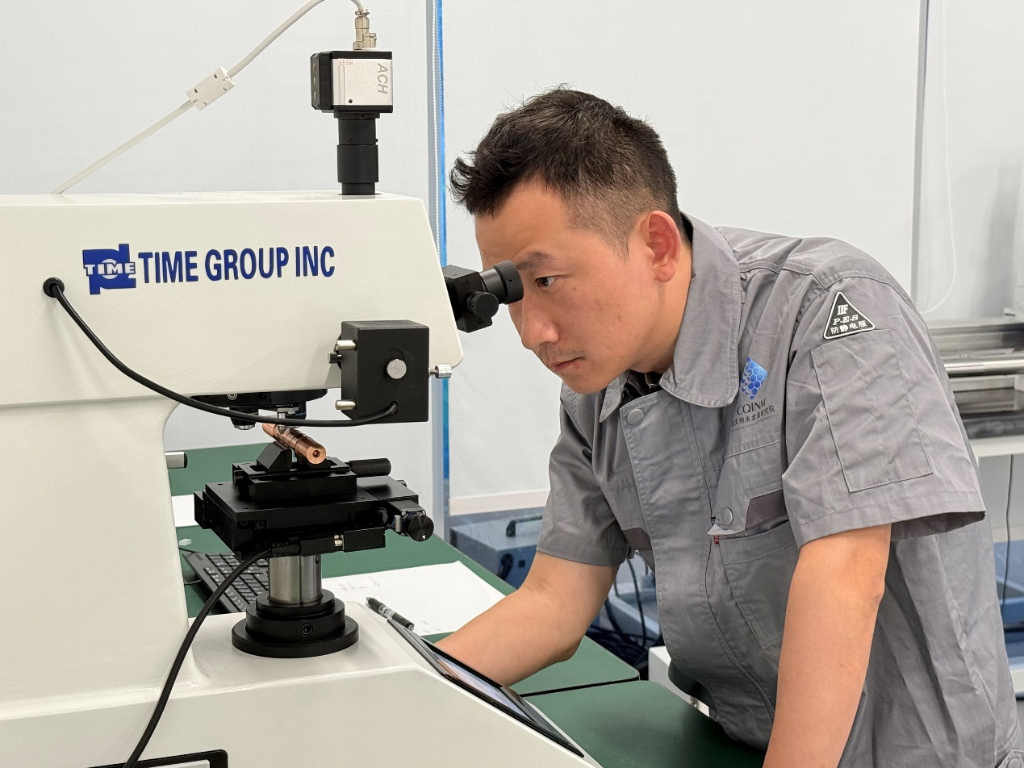 5月13日,重庆纳米金属研究院材料工程师黄椿森正在对工程金属实验件做表面性能测试。新华社记者 吴燕霞 摄
