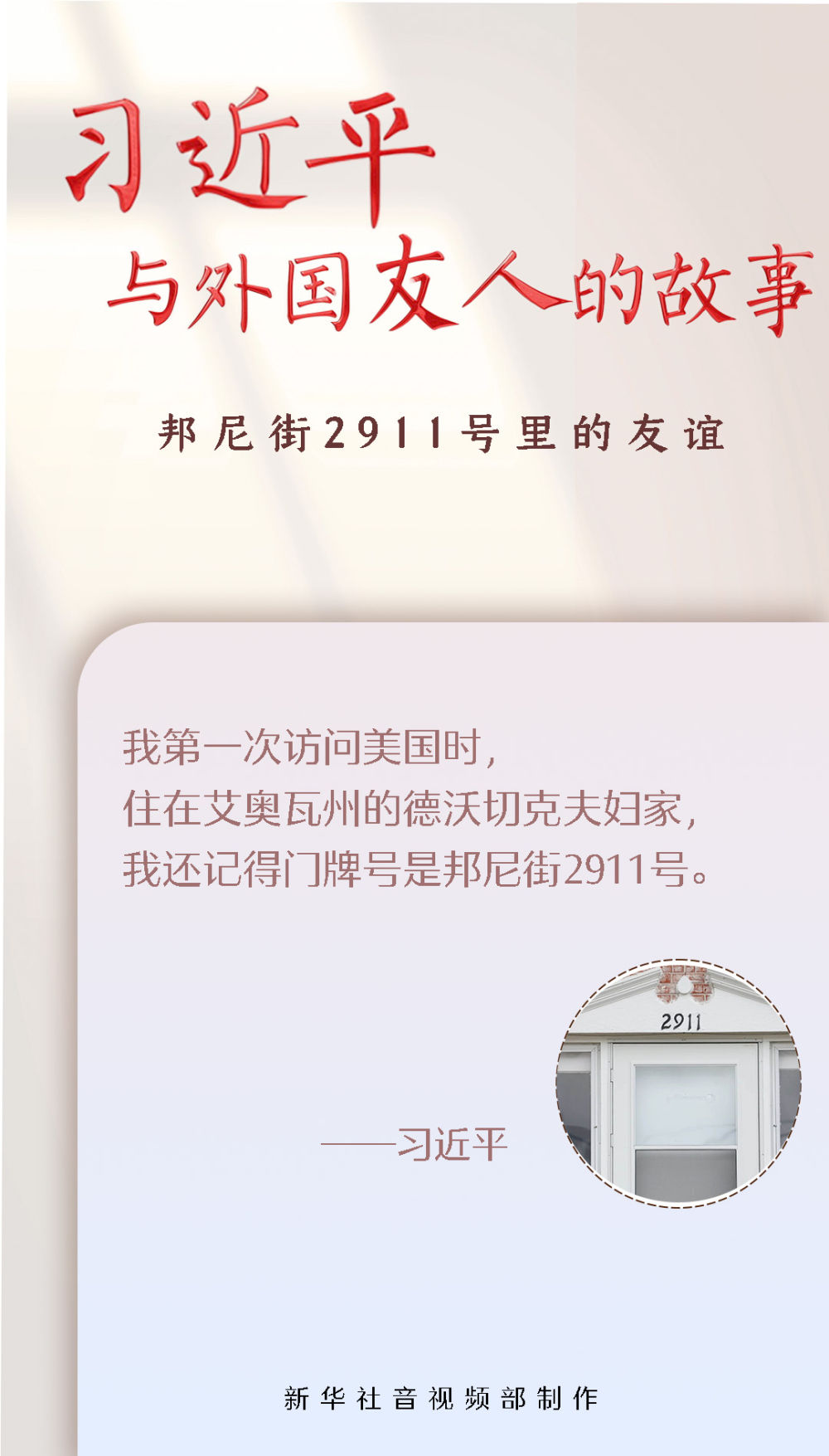 1985年,时任河北省正定县委书记的习近平率团访问艾奥瓦州,住在马斯卡廷邦尼街2911号的德沃切克夫妇家中。那是习近平同美国民众首次面对面接触,访问期间,他同当地人民结下了深厚友谊。