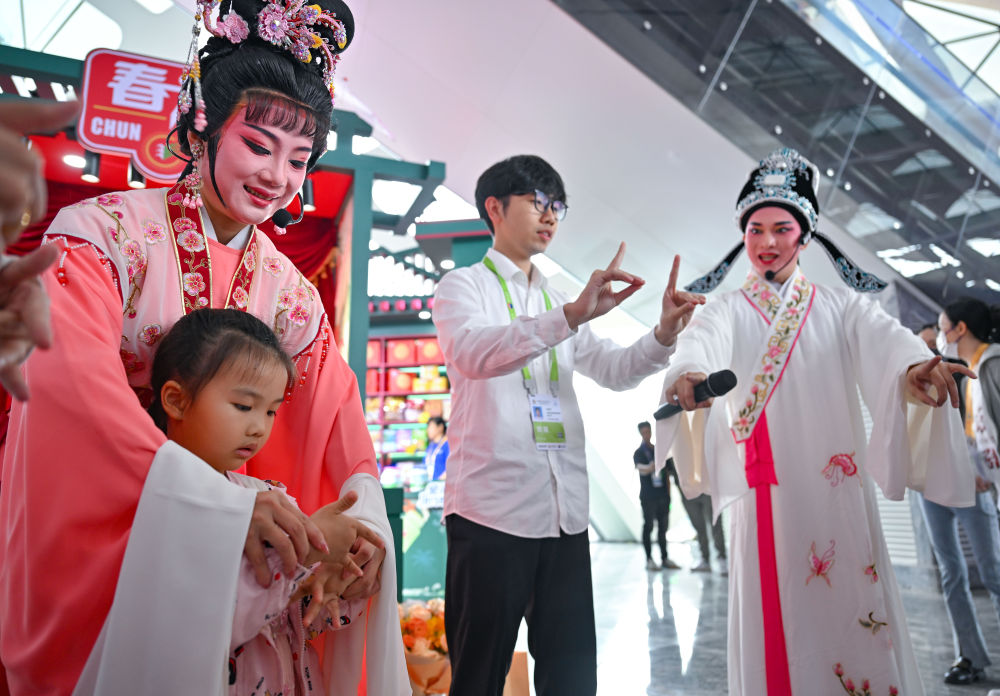 2025年4月13日,在海南举行的第五届中国国际消费品博览会上,琼剧演员与观众互动。