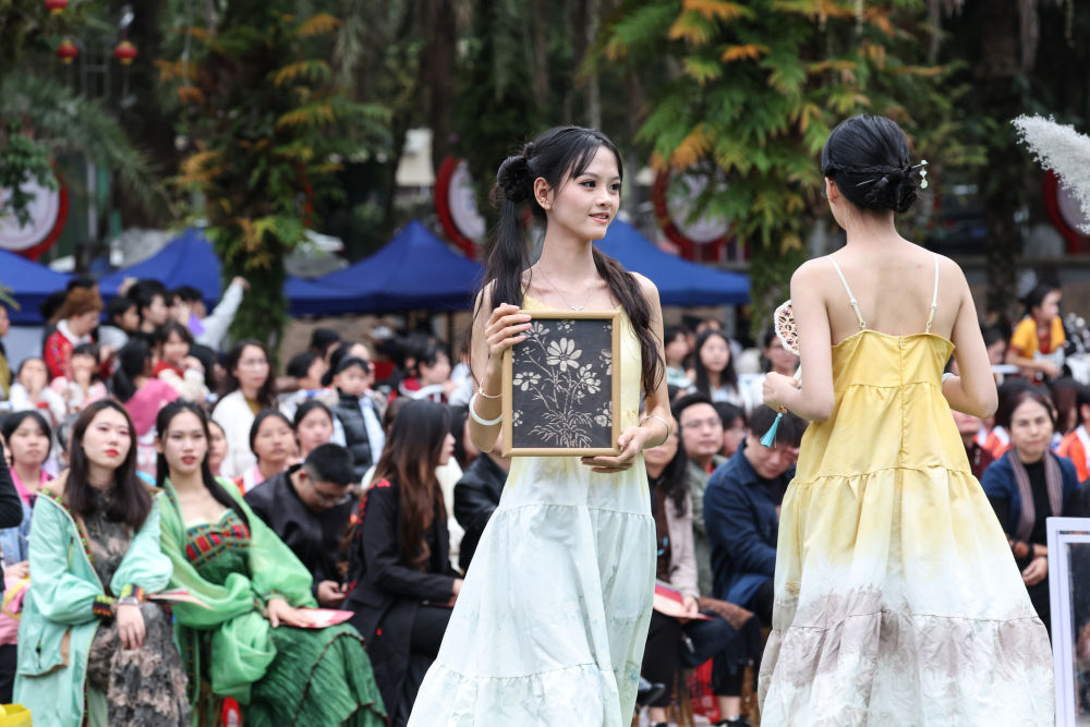 2024年12月29日,演员在海南五指山民族时装“村秀”迎新专场活动上展示当地文创产品。五指山“村秀”将黎族、苗族的传统服饰与时尚元素相结合,通过走秀、舞蹈等多种形式,展现五指山独特的文化魅力和乡村振兴新风貌,推动了当地文旅产业发展。