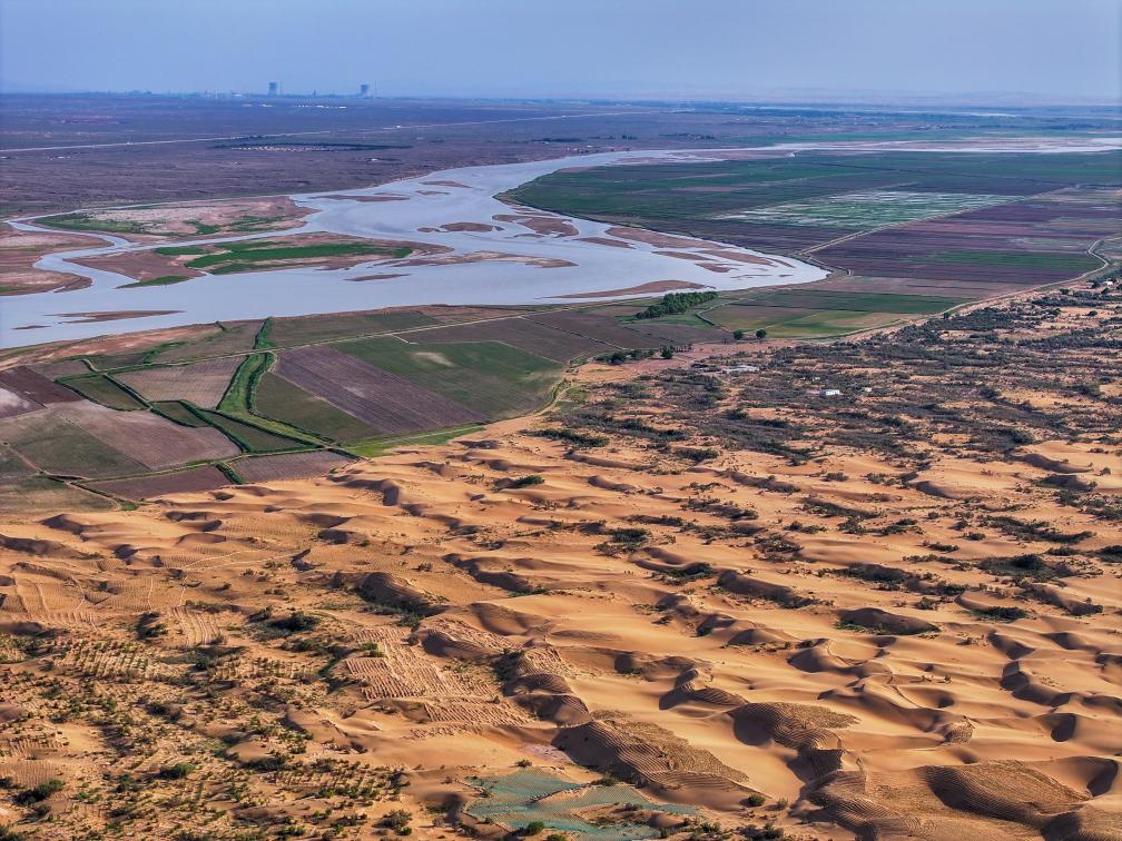 在巴彦淖尔市磴口县刘拐沙头,黄河岸线流沙治理工程锁住黄沙(2025年6月5日摄,无人机照片)。新华社记者 连振 摄