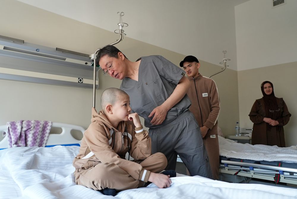 2025年2月20日,在位于乌兹别克斯坦塔什干的共和国耳鼻喉科及头颈疾病专业科学实践医疗中心,刘玉和医生(左二) 在术前查看患儿情况。新华社发(扎法尔摄)