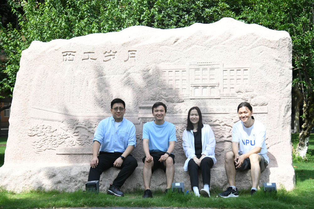 2024年6月26日,西工大哈萨克斯坦分校学生道托夫·铁木尔、博雷斯别克·穆拉特、伊萨耶娃·豪哈尔和图列加利·阿米尔(从左至右)在位于陕西西安的西北工业大学本部校园内合影。新华社记者 张博文 摄