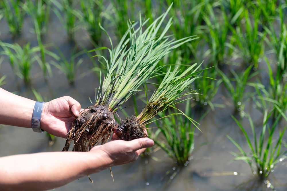 2025年6月18日,在黑龙江省双鸭山市宝清县一片水稻田旁,中国水稻研究所北方水稻研究中心科研人员查看应用寒地水稻秸秆全量原位还田缓释多效综合技术的水稻(左)与普通水稻的长势差别。该技术能够有效减少化肥用量、提升土壤有机质含量,节约成本、提产增效。