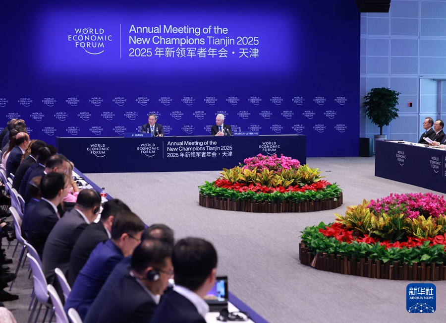 6月25日下午,国务院总理李强在天津出席2025年夏季达沃斯论坛工商界代表座谈会。新华社记者 王晔 摄