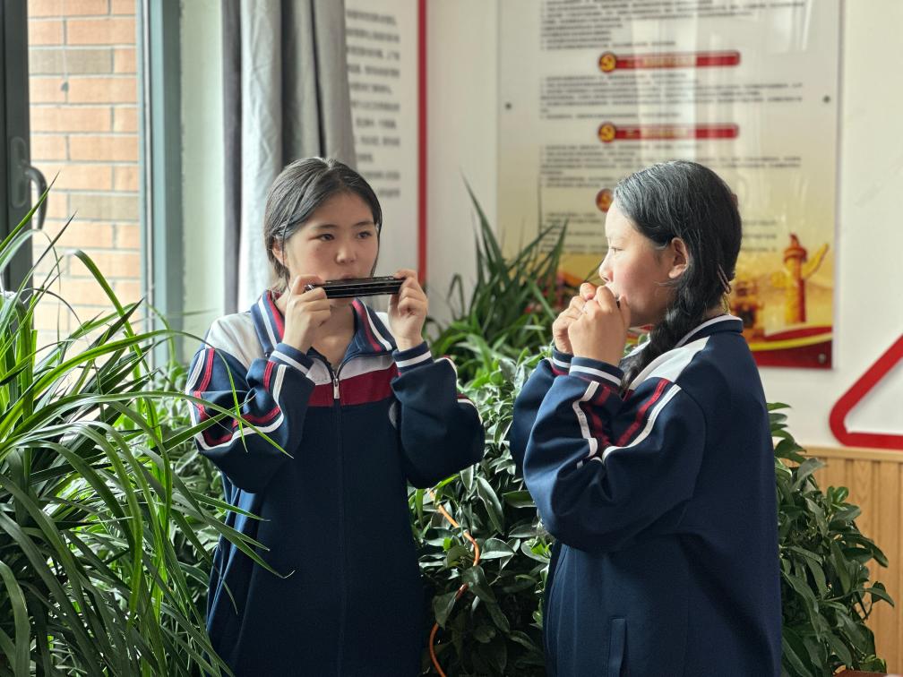 从高海拔牧区到省会西宁读书,可爱的老师、亲密的伙伴、舒适的学习生活环境,让2023年入学的果洛初中生闹拉很快适应。一入学,她就加入上海援青教师阚延俊组建的口琴社团,最爱的曲子是《友谊地久天长》。