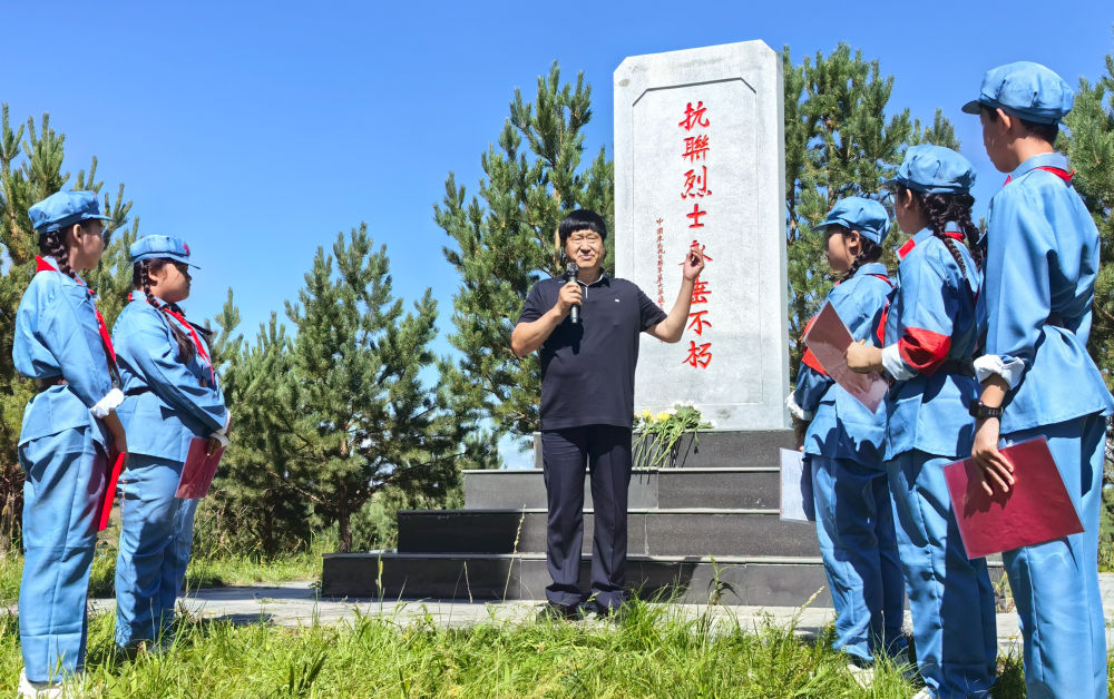 2025年8月14日,参加“重走抗联路”活动的学生在内蒙古呼伦贝尔市阿荣旗六合镇“红军岗”聆听东北抗联事迹介绍。1940年,东北抗联第三路军在此与日伪军激战,多名战士为保护村民壮烈牺牲。当地群众冒险将5位烈士遗体安葬于此,并立碑纪念。