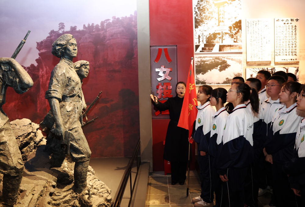 2025年4月3日,抗联中学学生在东北抗联史实陈列馆听讲解员讲述八女投江的故事。辽宁省本溪市本溪满族自治县抗联中学与东北抗联史实陈列馆相距不足百米,每年都会开展东北抗联精神教育活动,组织学生到陈列馆,向抗联英烈敬献花篮,缅怀抗战往事。近年来,为推动青少年更好地传承红色基因,辽宁积极推动抗联精神融入大中小学思政课一体化建设,编辑《中小学生抗联史读本》,围绕“继承抗联传统、学习抗联精神”等主题举办表演、征文、竞赛、夏令营和冬令营等活动。
