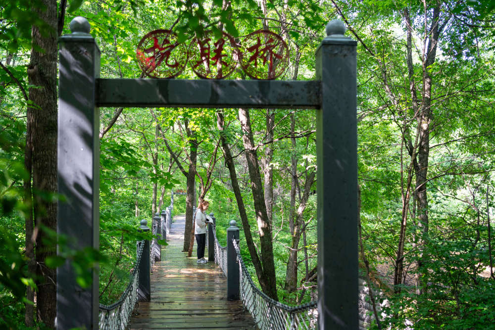 在黑龙江集贤县、桦南县、双鸭山市岭东区交界处的七星山间,分布着一系列东北抗联密营遗址。抗战时期,东北抗联在此建立起兵工厂、被服厂、军政干校、后方医院、秘密营地、修械所等抗日基地,为抗日斗争提供保障。近年来,当地加大对七星山国家森林公园的建设投入,发挥其红色教育、科普研学的爱国主义教育功能。这是2025年6月17日,游客在七星山国家森林公园参观。