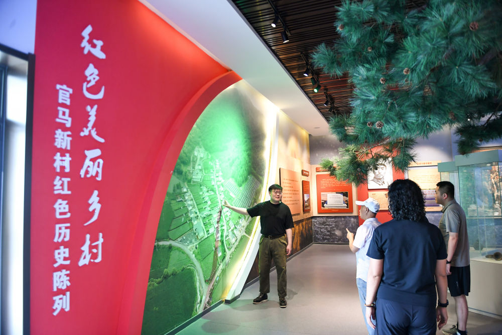 2025年8月11日,抗日民族英雄杨靖宇将军的曾孙马铖明(左一)在吉林省磐石市官马新村红色历史陈列馆为游客介绍抗联历史。