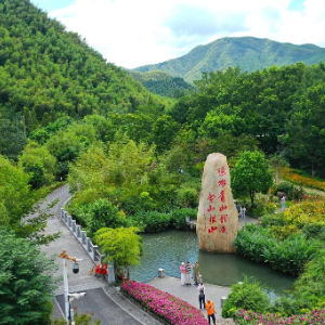 在浙江省湖州市安吉县余村,游客在刻有“绿水青山就是金山银山”的石碑前留影(2025年8月6日摄,无人机照片)。新华社记者 毛竹 摄
