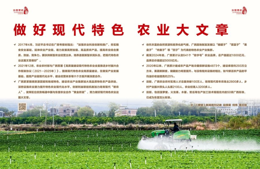 《广西壮族自治区人民政府关于加快推进广西现代特色农业高质量发展的指导意见》《广西加快推进现代设施农业发展实施方案(2023—2025年)》……广西出台实施一系列政策文件,紧紧围绕资源禀赋和地域特色,建设农业产业集群加大高品质特色农产品供给,深挖设施农业潜力提升特色农业现代化水平,创新利益联结机制加力培育现代“新农人”,发挥区位优势畅通中国与东盟农业合作“黄金桥梁”,努力做好现代特色农业这篇大文章。