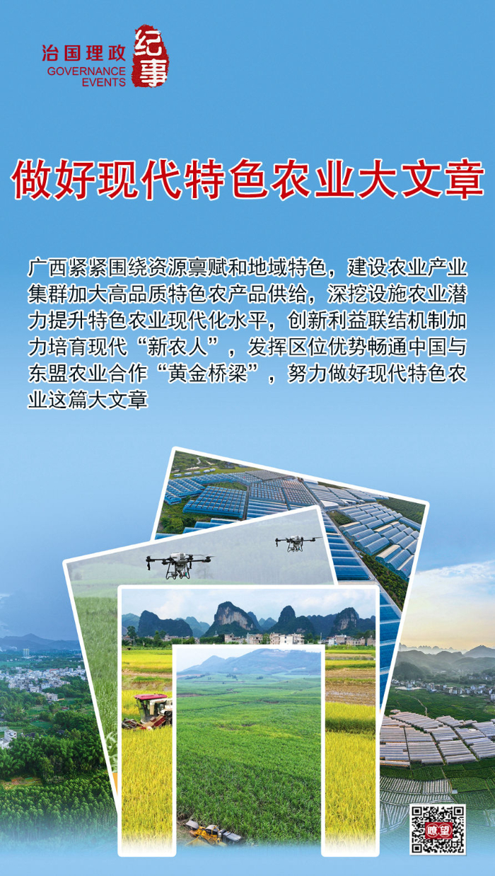 ◇广西紧紧围绕资源禀赋和地域特色,建设农业产业集群加大高品质特色农产品供给,深挖设施农业潜力提升特色农业现代化水平,创新利益联结机制加力培育现代“新农人”,发挥区位优势畅通中国与东盟农业合作“黄金桥梁”,努力做好现代特色农业这篇大文章。