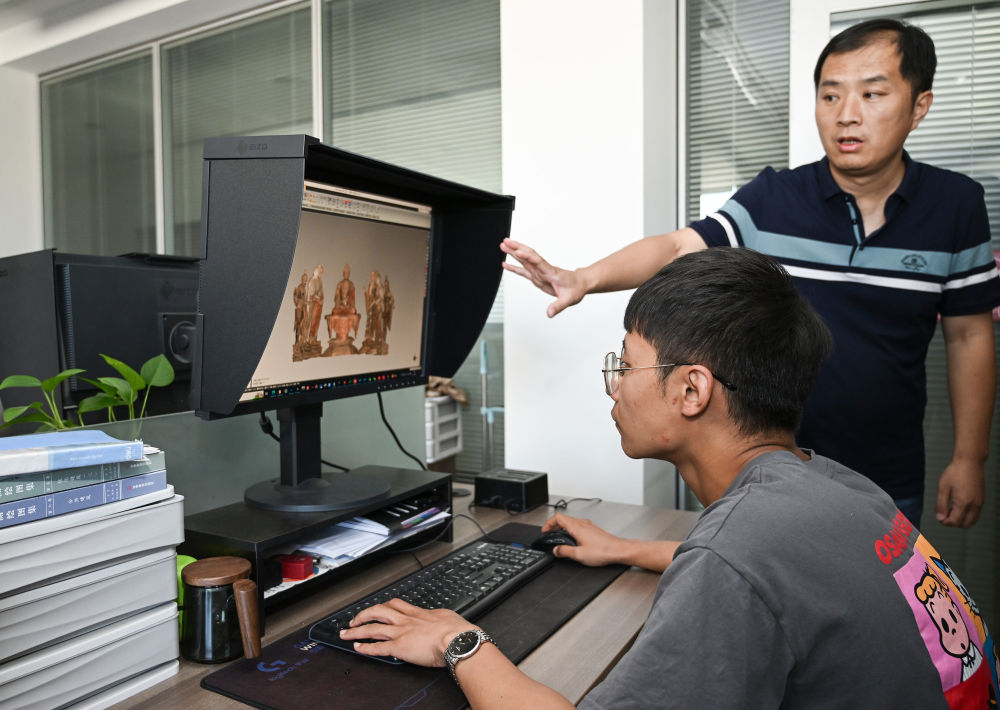 2023年8月3日,敦煌研究院文物数字化研究所的工作人员在展示莫高窟彩塑三维重建的成果。近年来,敦煌研究院持续加大文物保护基础研究和应用研究,不断加强文物科技保护力度,提升科研平台建设,为文物保护和文化遗产事业发展奠定良好基础。