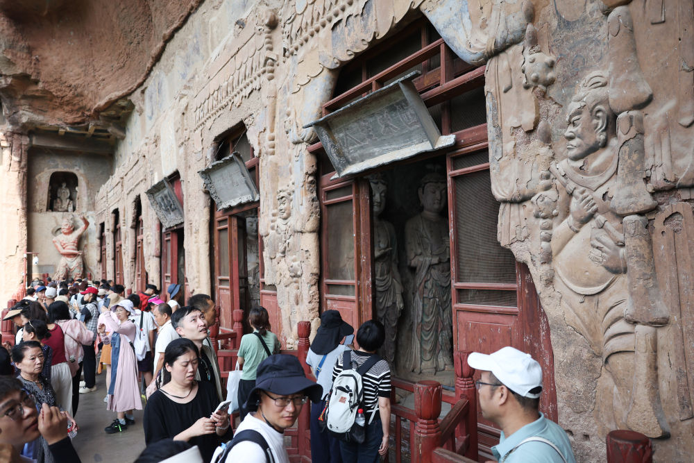 2025年7月16日,游客在麦积山石窟参观。