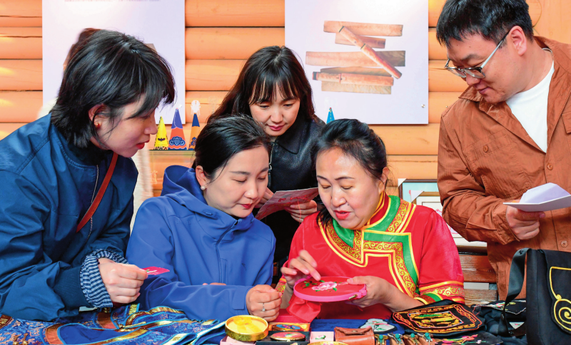 在内蒙古莫力达瓦达斡尔族自治旗,民间艺人为游客展示达斡尔族刺绣技艺(2025年4月28日摄) 新华社发