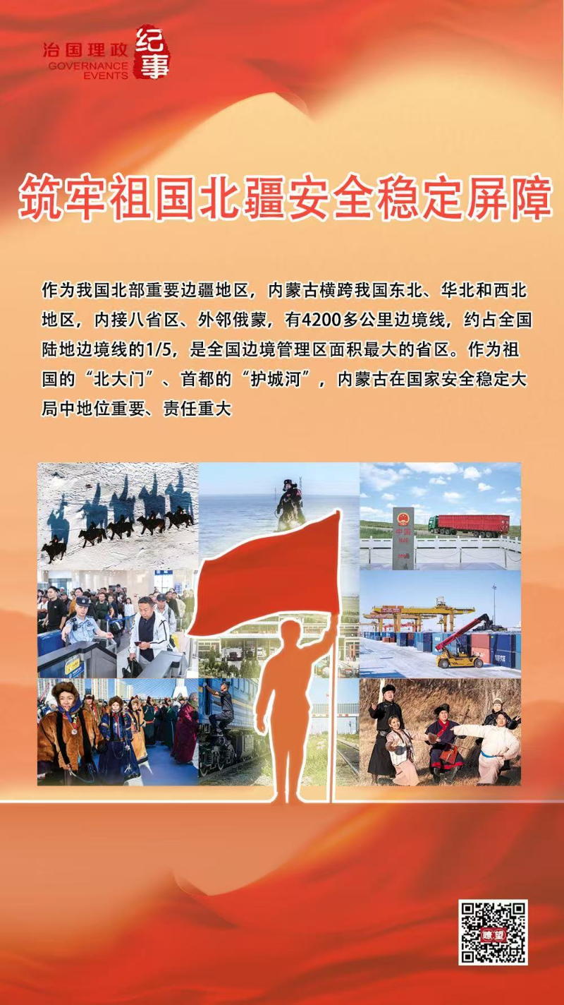2023年10月,国务院印发《关于推动内蒙古高质量发展奋力书写中国式现代化新篇章的意见》,提出从全面推进民族团结进步事业、加强基本民生保障、提高公共服务水平、加强守边固边兴边、防范化解重点领域风险等方面,推动内蒙古在筑牢祖国北疆安全稳定屏障上展现新作为。