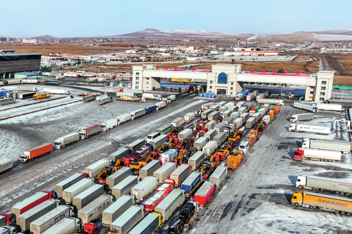 出入境货车排队通过满洲里公路口岸(2025年12月3日摄)。新华社发(肖建波摄)