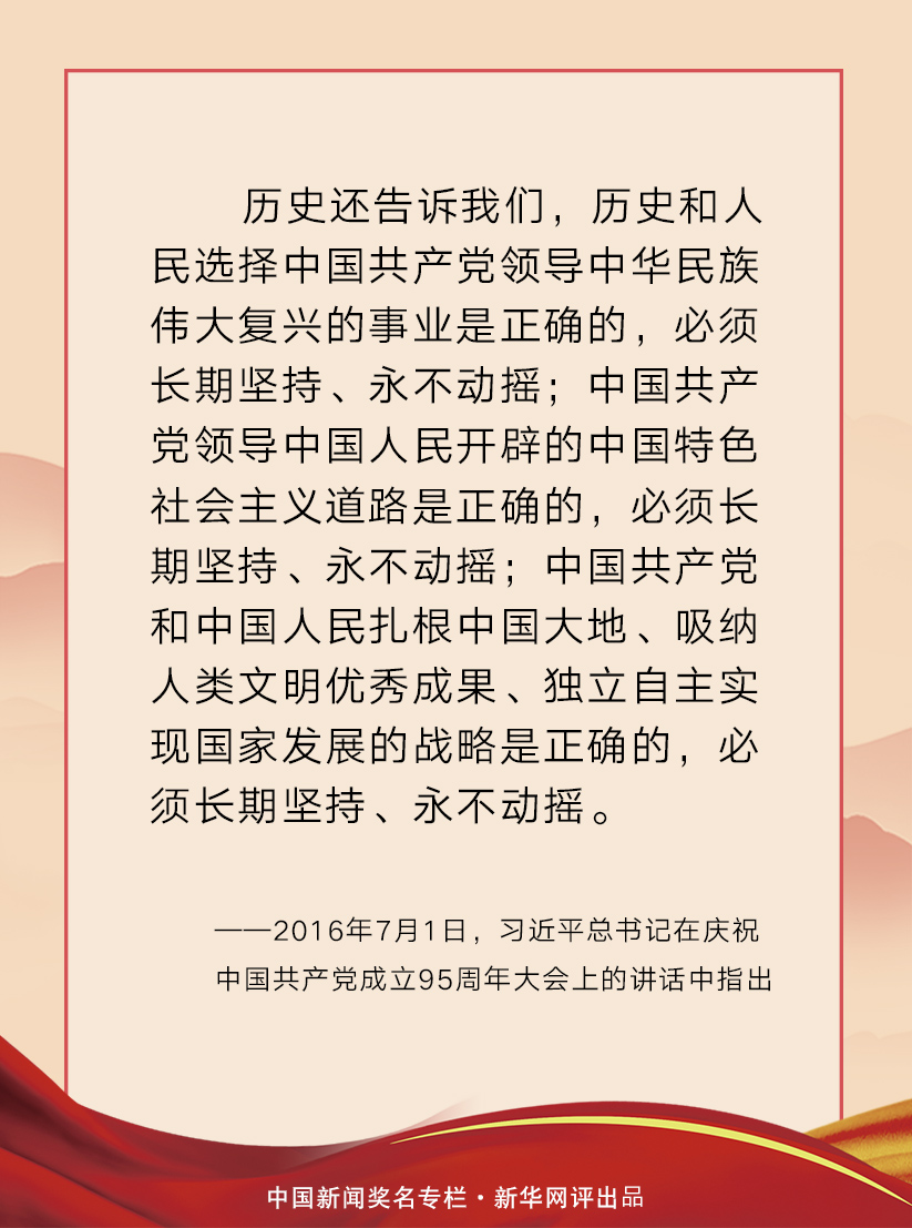 沧海横流显砥柱,万山磅礴看主峰。历史告诉我们,历史和人民选择中国共产党领导中华民族伟大复兴的事业是正确的,必须长期坚持、永不动摇。不忘初心、继续前进的中国共产党,必将团结带领亿万中华儿女继续夺取中国特色社会主义新的伟大胜利!(文字:马若虎 海报:张倩)