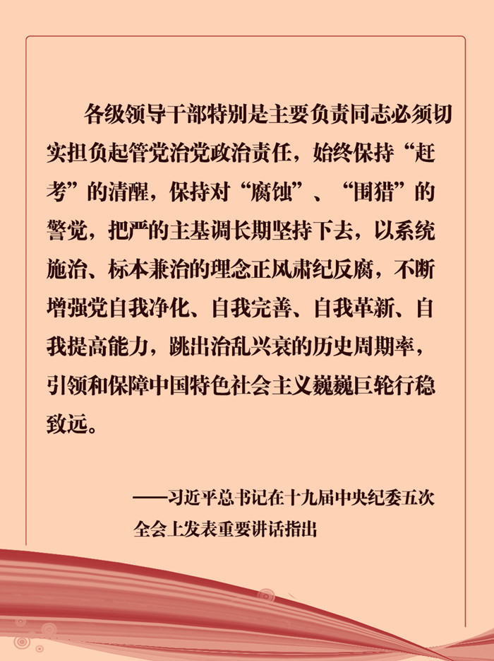 十九届中央纪委五次全会近日召开,习近平总书记在会上发表重要讲话,充分肯定过去一年全面从严治党取得新的重大成果,深刻阐述全面从严治党新形势新任务,明确要求各级领导干部特别是主要负责同志必须切实担负起管党治党政治责任。