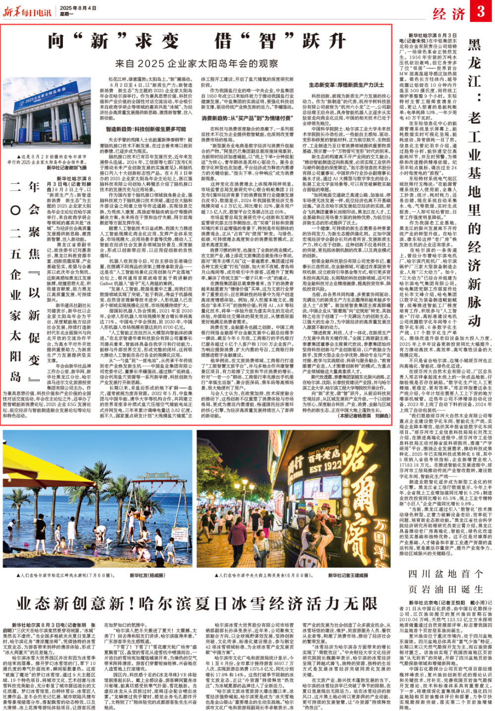 8月2日至4日,以“新质生产力:新智造 新消费 新生态”为主题的2025企业家太阳岛年会在哈尔滨举行。作为兼具思想价值、科技价值和产业价值的全国性对话交流活动,年会吸引来自政商学研企等领域的嘉宾共赴“冰城”,为经济社会高质量发展提供新思路、激荡新智慧、注入新动能。