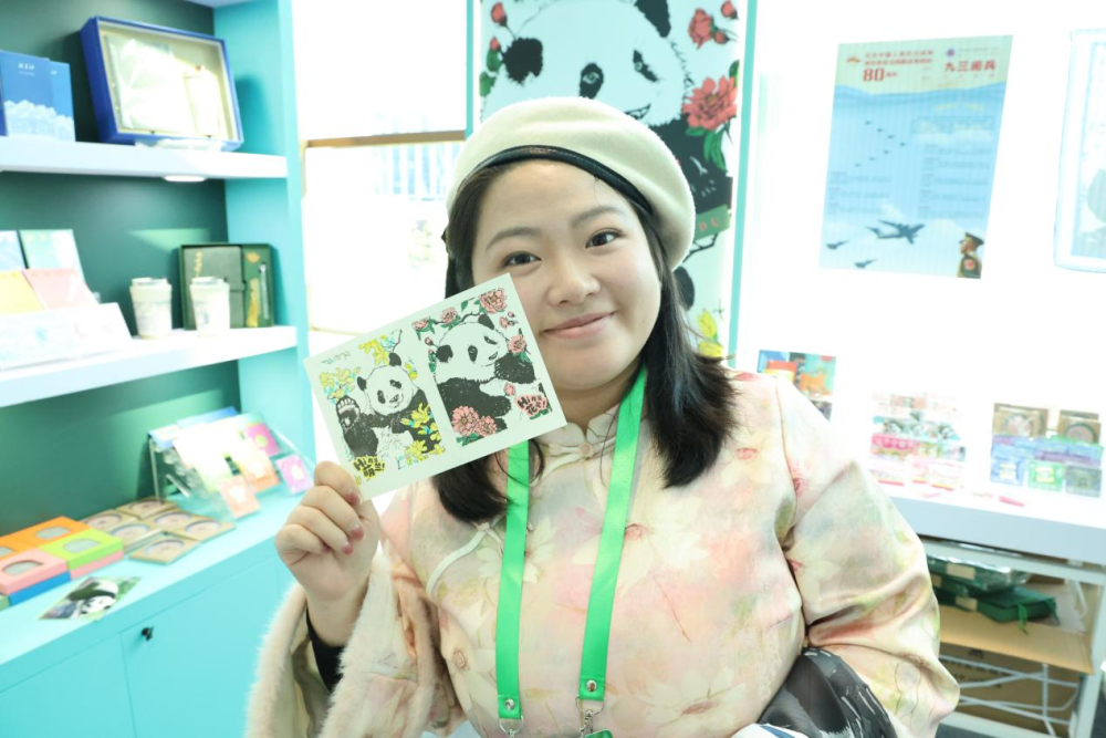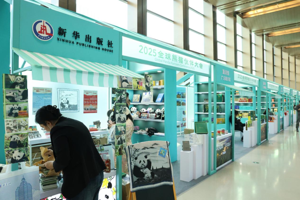 新华出版社携2025全球熊猫伙伴大会纪念版丝巾、《当萌兰遇到花花》纪念画册等熊猫系列文创亮相大会市集。