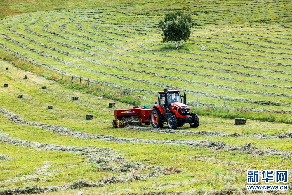 牧民们驾驶着拖拉机收割牧草