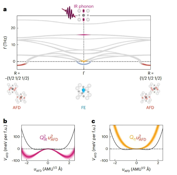 在这些物理学中,至关重要的是极性不稳定性和反铁畸变旋转之间竞争,这在平衡态时,阻碍了长程铁电性的形成。利用高强度中红外光脉冲,以共振驱动17THz的Ti–O伸缩模式,并在自由电子激光器上,使用时间分辨X射线漫散射,测量了由此产生的晶格涨落变化。在快速增加之后,观察到了R点反铁畸变晶格涨落的长寿命猝灭。