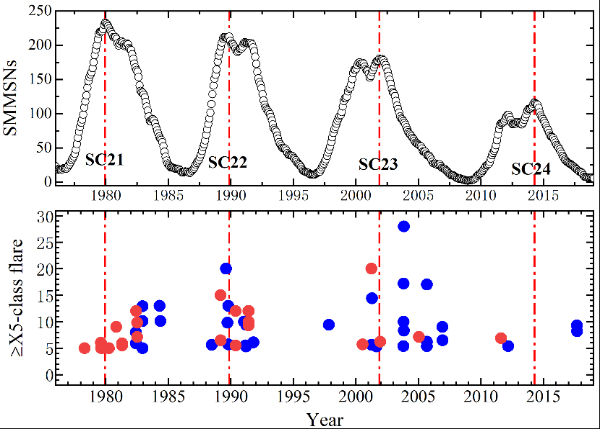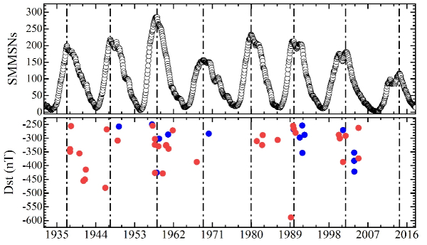 1932-2018年期间的超级磁暴,红色实心圆点代表该超级磁暴是由太阳北半球的日冕物质抛射事件造成的,蓝色实心圆点代表该超级磁暴是由太阳南半球的日冕物质抛射事件造成的。