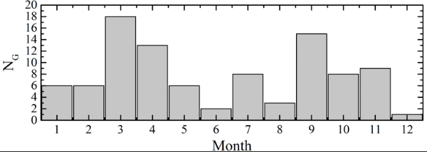 答:其中,超过65%出现在太阳活动周的下降段,超过80%出现在太阳黑子活动峰值的前两年和后三年期间,此外,与磁层相互作用形成的极端空间天气主要出现在春分和秋分附近。