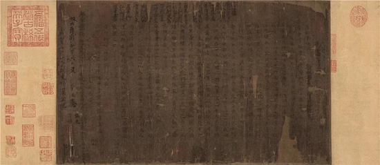 本卷除了能在一定程度上为我们揭示出东晋楷书的典型面貌外,更重要的是其上的诸多押署与题跋:文首后“僧权”字样是极其罕见的梁朝鉴定家徐僧权押署,“满骞”“怀充”同样是梁朝鉴藏者押号;书心上方有唐宋八大家之首韩愈唯一存世书迹题跋,“国子博士韩愈、赵元遇、著作佐郎樊宗师、处士卢同。元和四年五月二十日,退之题。”并且是自左而右书写;第二十四行的“雍题文云”之下草书一行,则是草圣怀素所书“大历三年秋九月三日沙门怀素藏真题”。